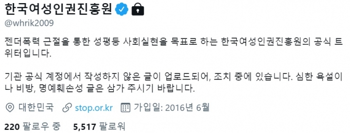 한국여성인권진흥원 욕설 트윗 올렸다가 삭튀.news.